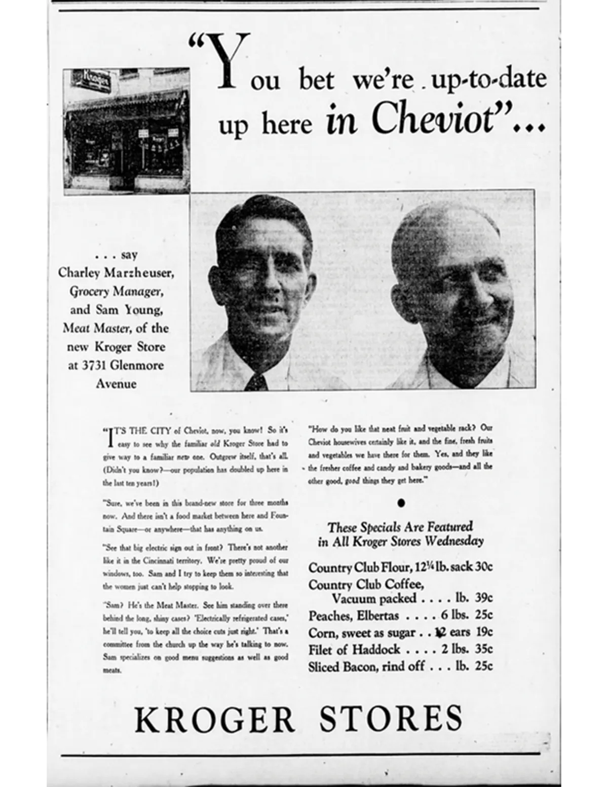 Coordinator Rich Juzwick’s roots to the City of Cheviot stretch back to the early 20th century. His Great-Grandfather, Joseph Phoenix (Phinichisi) established one of the early brick buildings in Downtown Cheviot, in the mid-1920’s. Located on Glenmore Ave this building housed 3 apartments on its second floor and 3 store fronts (3729, 3731, 3733 Glenmore). Notable businesses located at this location: Kroger (the first in Western Hills!), Glenmore Grill, Glenmore Cleaners, Judy Link’s School of Dance & Baton, Chevwood Taxi & many more!
